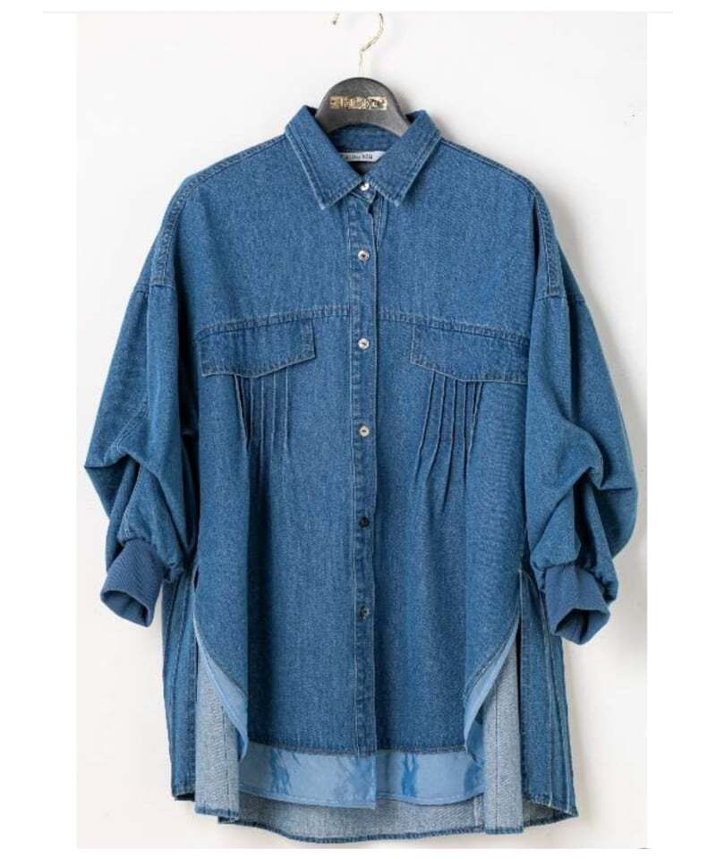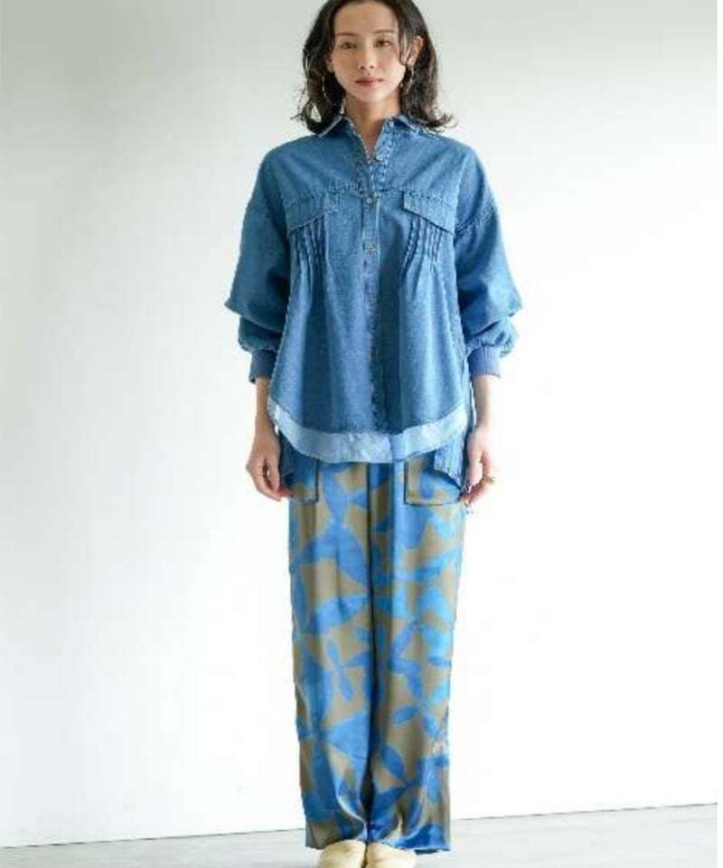 ラリア・ムーの代名詞アイテムでもあるプリーツシャツをトレンドのデニムで。程よい肉感でしっかりとした強度を持つ生地に加工を施し柔らかな表情をプラス。今季はバスト部分とサイドにピンタックプリーツをあしらい、裾にはオーガンジーをドッキングし軽さを出しました。やや長めのフレアデザインを採用し、腰回りをしっかりとカバーしつつ、深めのラウンドしたサイドスリットが重見えを防ぐため、低身長の方もバランスよく着用可能です。袖口はリブ仕様で腕にフィットし、ブラウジングにも役立ちます。袖の内側には長さ調節に役立つボタン付きでボリュームや長さの調節が可能。開衿仕立てで手軽に羽織れる軽羽織として初秋から活躍します。