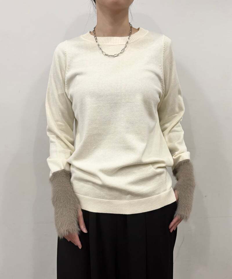 32/2COTTON 1枚でもインナーとしても着れる袖口部分がシャギー切り替えになったフィンガーリブニットです。袖のリブを長めにし指が出せる仕様になっているのがポイントです。インナーとしてベストやジレなどにレイヤードしていただくのがおすすめです。 毎年定番のコットン100ニット!! 通気性、吸湿性が高く、さらっとシーズン問わず着用いただけ、自宅でケアできるのが特徴な素材です。