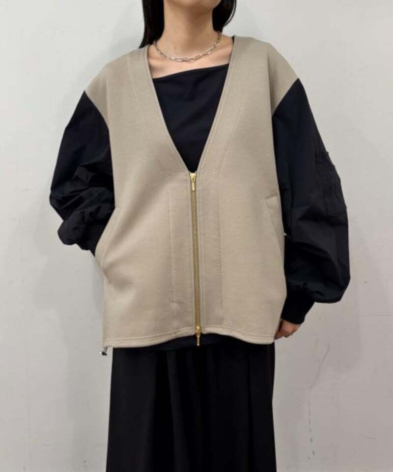異素材をドッキングさせたMA-1風ジャケット。 身頃はダブルフェイス素材で袖にはナイロンの少しハリ感のある素材を使用しています。 肘部分に入れた深めのタックでボリュームを出した袖がポイントです。