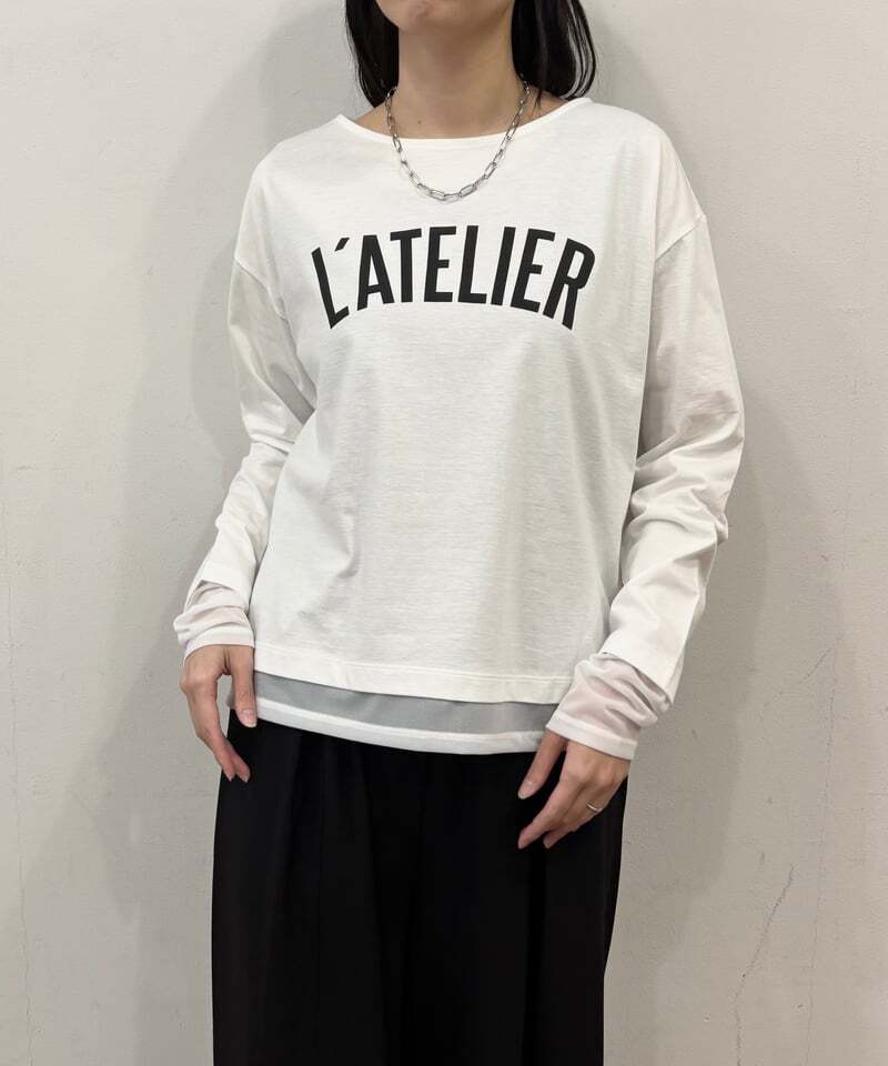 シャリ感のあるオーガンジーとコットン素材の天竺をドッキングしたレイヤード風のロゴTshirt。 シアーのオーガンジーで抜け感があり、着るだけでレイヤードスタイルが楽しめます。 L'ATELIERはアトリエ(工房)という意味です。